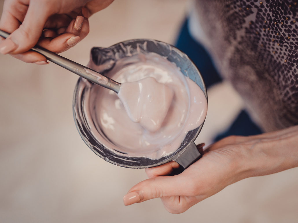 Färbemittel ist nicht gleich Färbemittel. Lotionen, Cremes und Mousse – die schönen Farben erhälst du in den unterschiedlichsten Konsistenzen. Für Anfänger*innen ist in der Regel eine Mousse am einfachsten. Sie sieht so ähnlich aus wie ein Stylingschaum und hat den großen Vorteil, dass sie nicht tropfen kann. Außerdem lässt sich eine Mousse auch recht einfach gleichmäßig auf dem Kopf verteilen.
